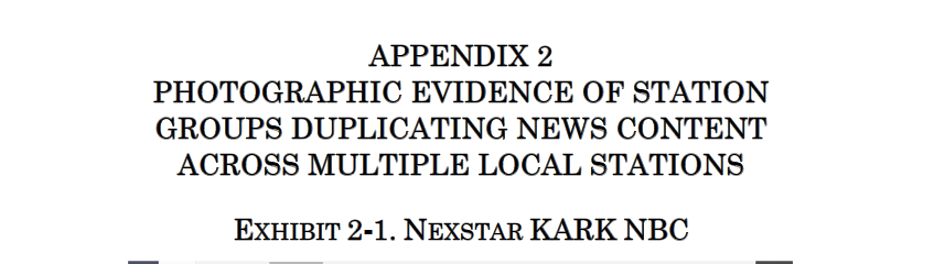 We have provided evidence obtained online showing stations duplicating the same news stories on their multiple stations' websites from huge groups to small. However, the question is whether what stations report online accurately represents what stations are doing over our air.